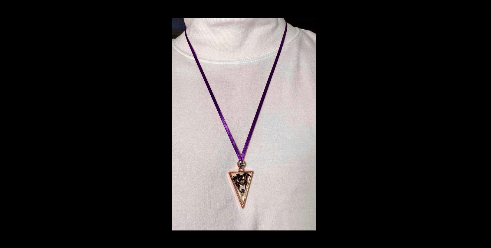 This charming "Butterfly Bush" rose gold colored pendant has been grown, dried, carefully hand-pressed, and immortalized in crystal clear resin with a little bit of sparkle, forever capturing its beauty. This unique piece of artwork can be displayed as an elegant necklace or a light-catching decoration piece. This pendant includes an eye-catching rose gold colored metal bezel, an engraved silver colored metal bead, a colorful violet 1/8" satin ribbon that hangs 11 inches, and is equipped with a rose gold colored lobster clasp.