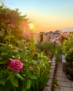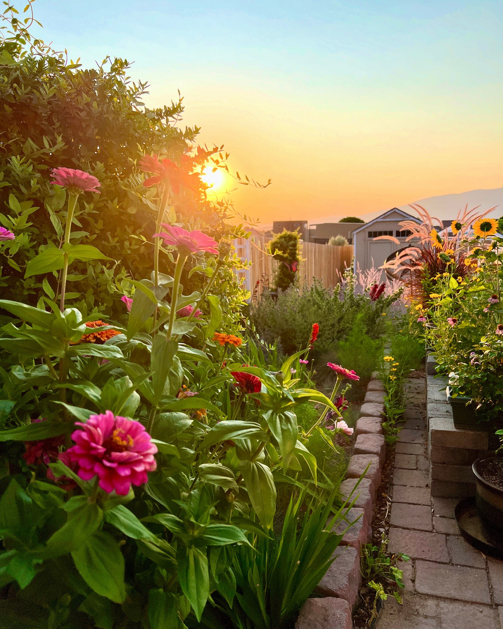 Decorate a space in your home or office that needs a moderate touch of color and tranquility and get lost in the peaceful sunrise coming up over my colorful cottage garden. This picture was taken the summer of 2024 and is captured forever as a 12” X 12” canvas print.