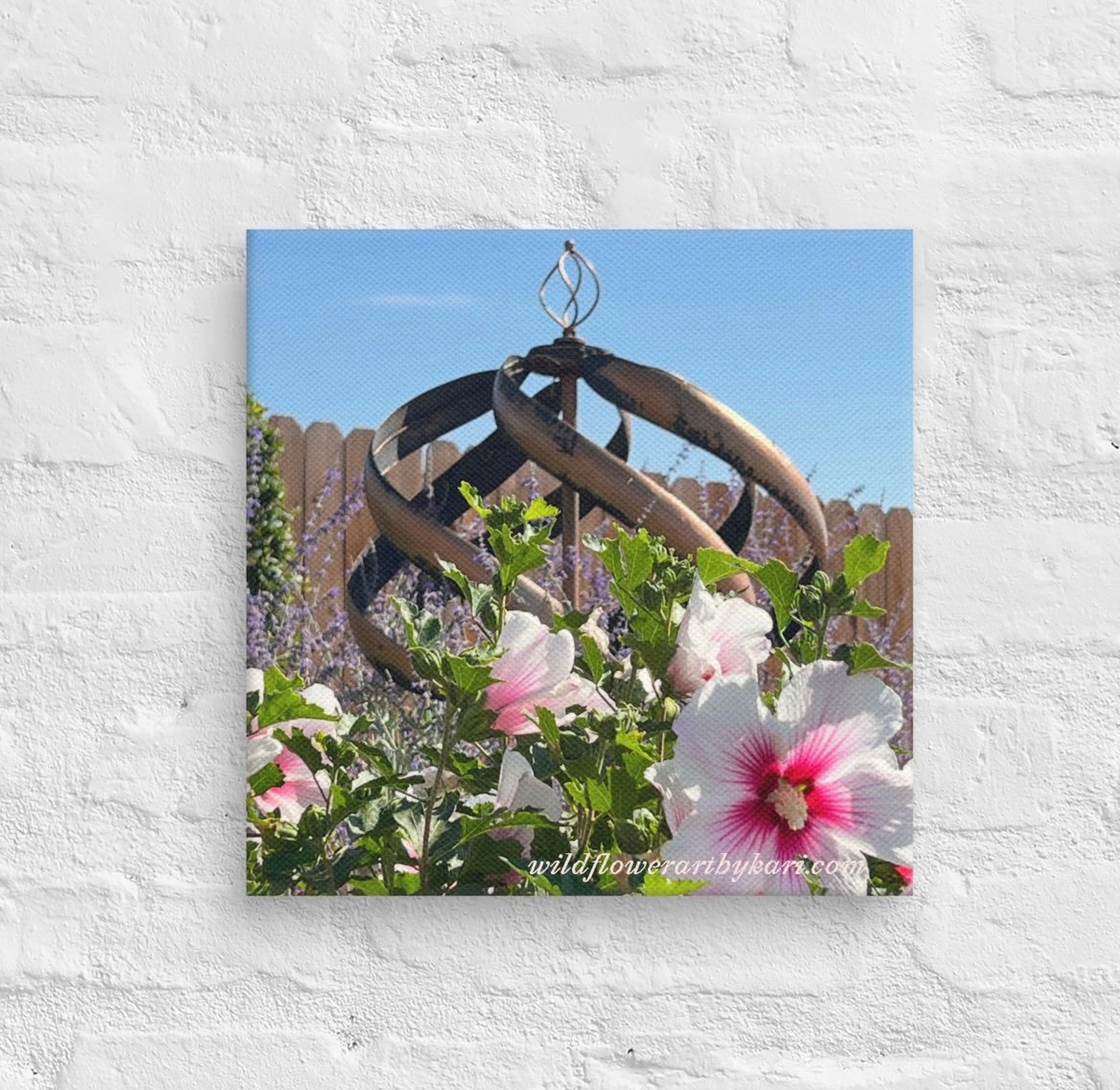 Decorate a space in your home or office that needs a moderate touch of color and tranquility while admiring my beautiful Hibiscus and weathered copper windspinner. This picture was taken the summer of 2025 in my garden and is captured forever as a 12” X 12” canvas print.