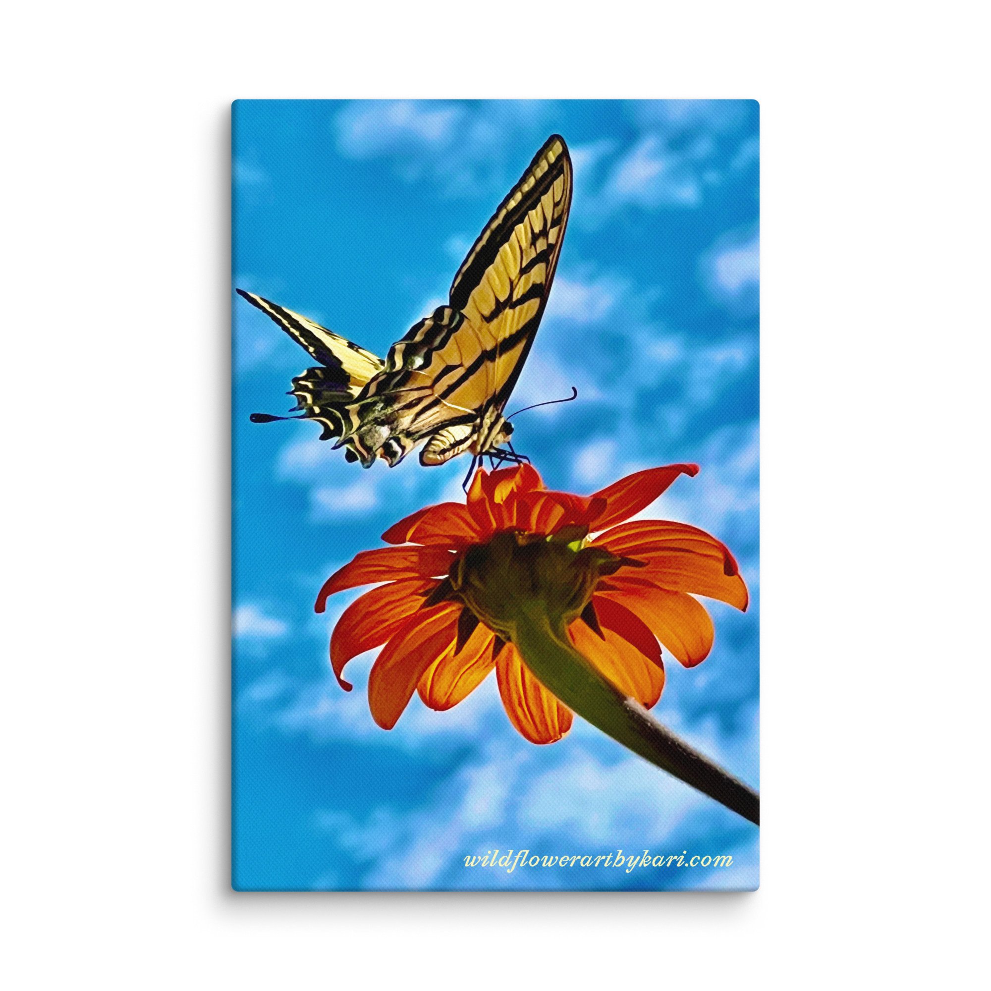Decorate a space in your home or office that needs a moderate touch of color and tranquility. Enjoy this lovely Swallowtail butterfly landing on a Tithonia bloom in my garden. This picture was taken the fall of 2024 and is captured forever as a 8” X 12” canvas print.