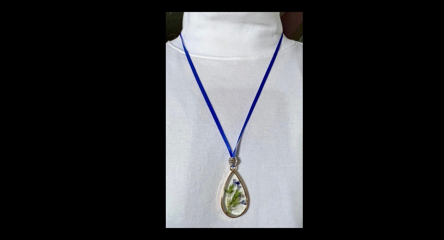 This charming "Catmint" gold colored pendant has been grown, dried, carefully hand-pressed, and immortalized in crystal clear resin with a little bit of sparkle, forever capturing its beauty. This unique piece of artwork can be displayed as an elegant necklace or a light-catching decoration piece. This pendant includes an eye-catching gold colored metal bezel, an engraved silver colored metal bead, a colorful royal blue 1/8" satin ribbon that hangs 11 inches, and is equipped with a gold colored lobster clasp.