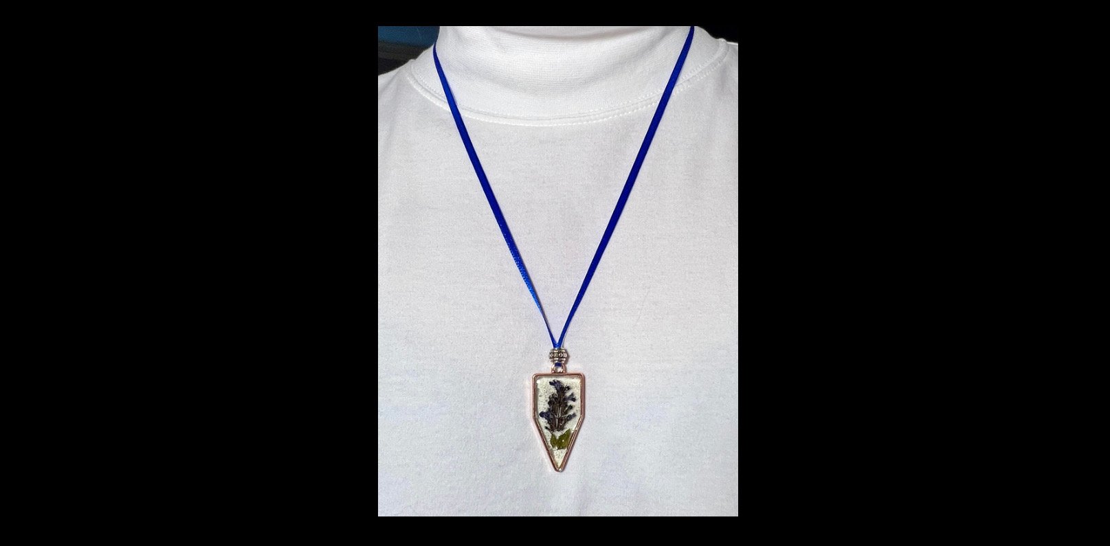 This charming "Catmint" rose gold colored pendant has been grown, dried, carefully hand-pressed, and immortalized in crystal clear resin with a little bit of sparkle, forever capturing its beauty. This unique piece of artwork can be displayed as an elegant necklace or a light-catching decoration piece. This pendant includes an eye-catching rose gold colored metal bezel, an engraved silver colored metal bead, a colorful royal blue 1/8" satin ribbon that hangs 11 inches, and is equipped with a rose gold colored lobster clasp.