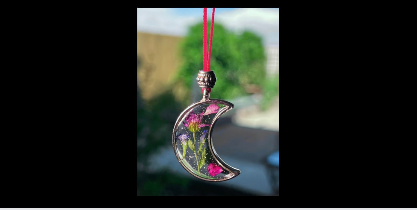 This charming silver-colored moon pendant features blooms of Chrysanthemum, Catmint, and pink Stock flower. These beautiful flowers were grown, dried, carefully hand-pressed, and immortalized in crystal clear resin with a little bit of sparkle, forever capturing their beauty.