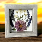 These beautiful Cosmos, Veronica and Chrysanthemum wildflowers were personally grown and harvested from my garden. They have been carefully hand-pressed, dried and framed in a 6” X 6” weathered gray shadow box frame with glass. This unique piece of artwork forever captures the beauty of these wildflowers and will provide a gorgeous display for that perfect spot on a wall or desk within your home or office.