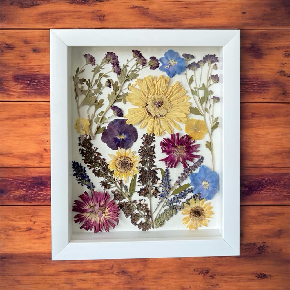 These beautiful Daisy, Delphinium, Chrysanthemum, Butterfly Bush, Pansy, and Zinnia wildflowers were personally grown and harvested from my garden. They have been carefully hand-pressed, dried, and framed in a 8X10 vibrant white shadow box frame with glass. This unique piece of artwork forever captures the beauty of these wildflowers and will provide a gorgeous display for that perfect spot on a wall or desk within your home or office.