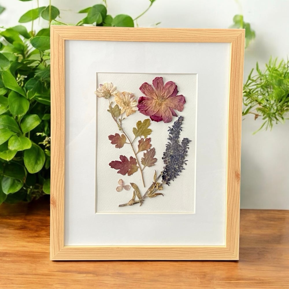 These beautiful Chrysanthemum, Rose, Veronica and Hydrangea wildflowers were personally grown and harvested from my garden. They have been carefully hand-pressed, dried and framed in a 8" X 10" natural wood-look picture frame with glass. This unique piece of artwork forever captures the beauty of these wildflowers and will provide a gorgeous display for that perfect spot on a wall or desk within your home or office.