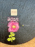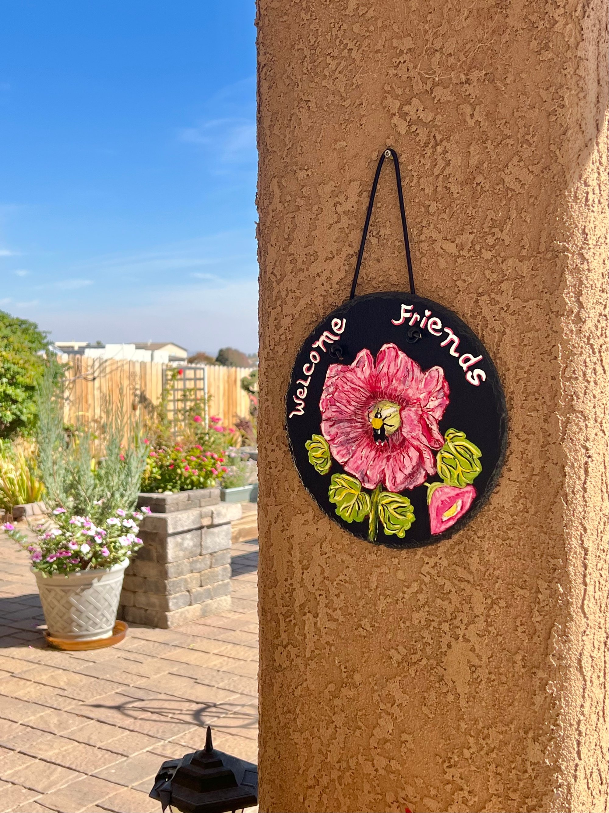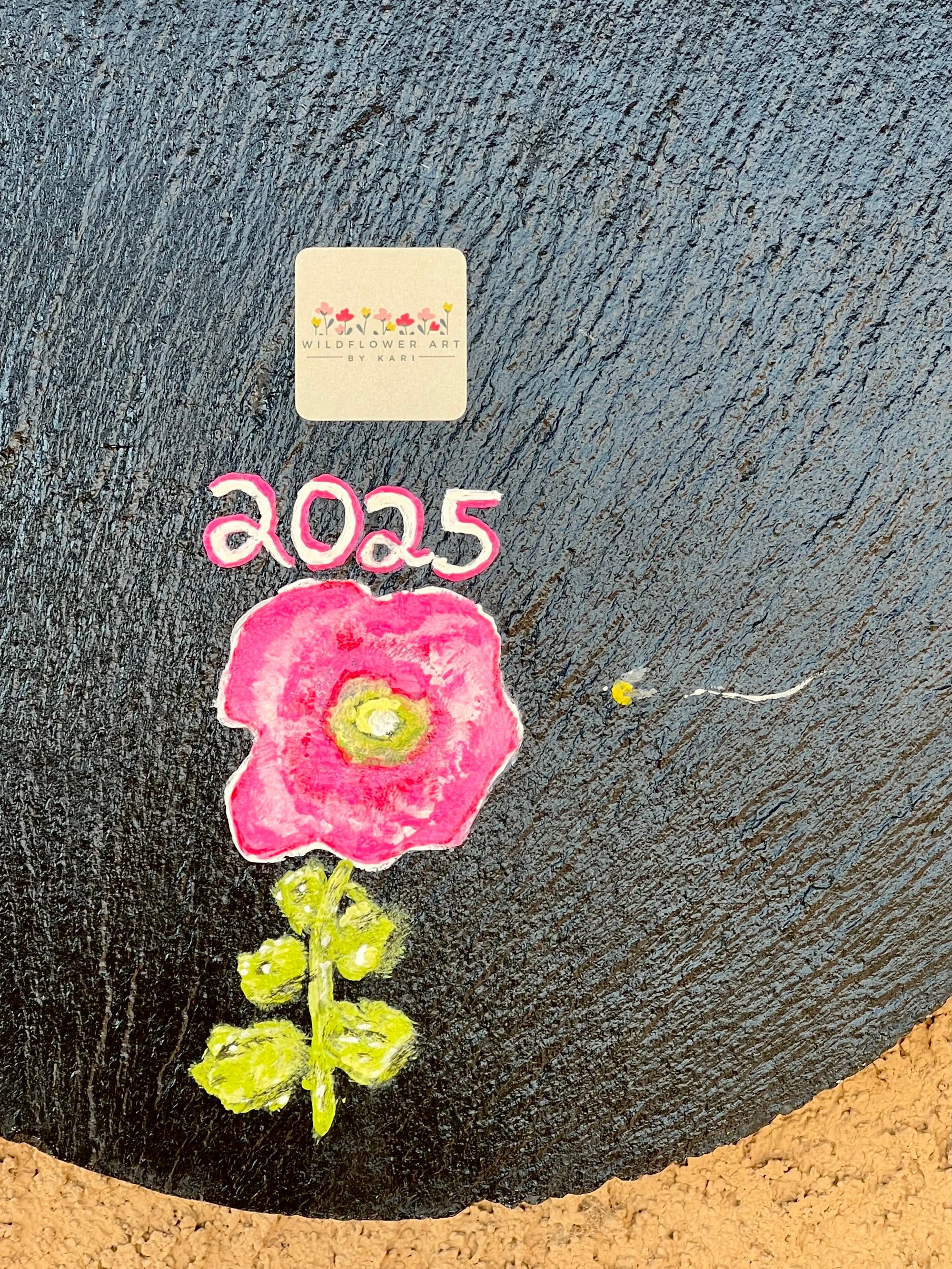 This genuine and charming "Hollyhock and Bee" round garden slate is hand-painted and was inspired by a photo I captured in my garden of a busy little Bumble Bee pollinating one of my beautiful Hollyhocks the summer of 2025.