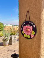 The circumference of this painted slate piece is approximately 9-1/2” and is hung by a 6" black rawhide cord that can be shortened by adjusting the knots. It is painted with acrylic paints and varnished for indoor or outdoor use and is perfect for a porch or patio entry way.