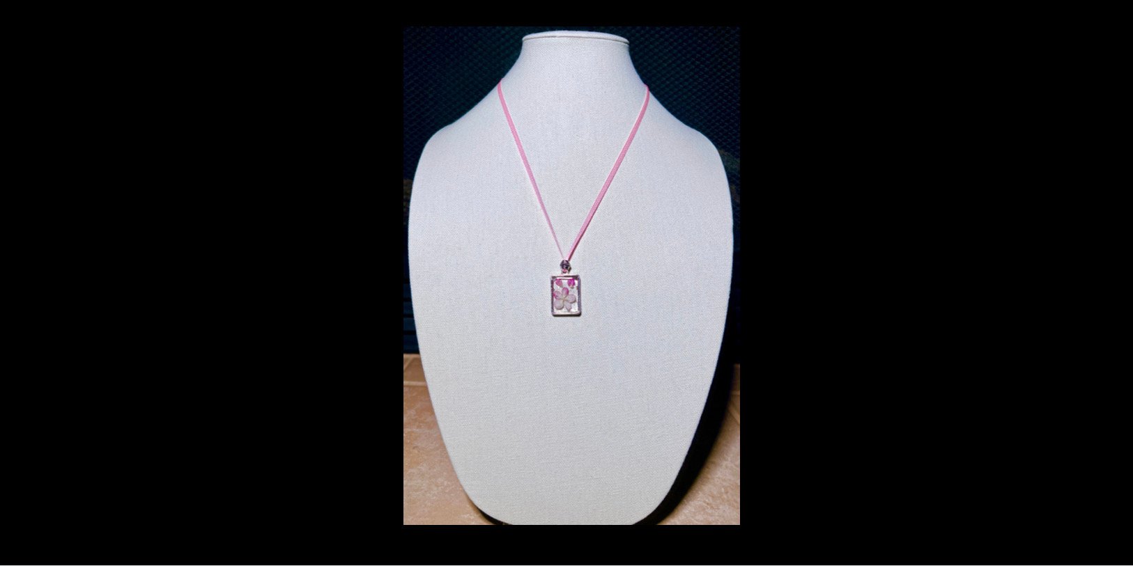 This unique piece of artwork can be displayed as an elegant necklace or a light-catching decoration piece. This pendant includes an eye-catching silver-colored metal square bezel, an engraved silver colored metal bead, a colorful light pink 1/8" satin ribbon that hangs 11 inches, and is equipped with a silver colored lobster clasp.