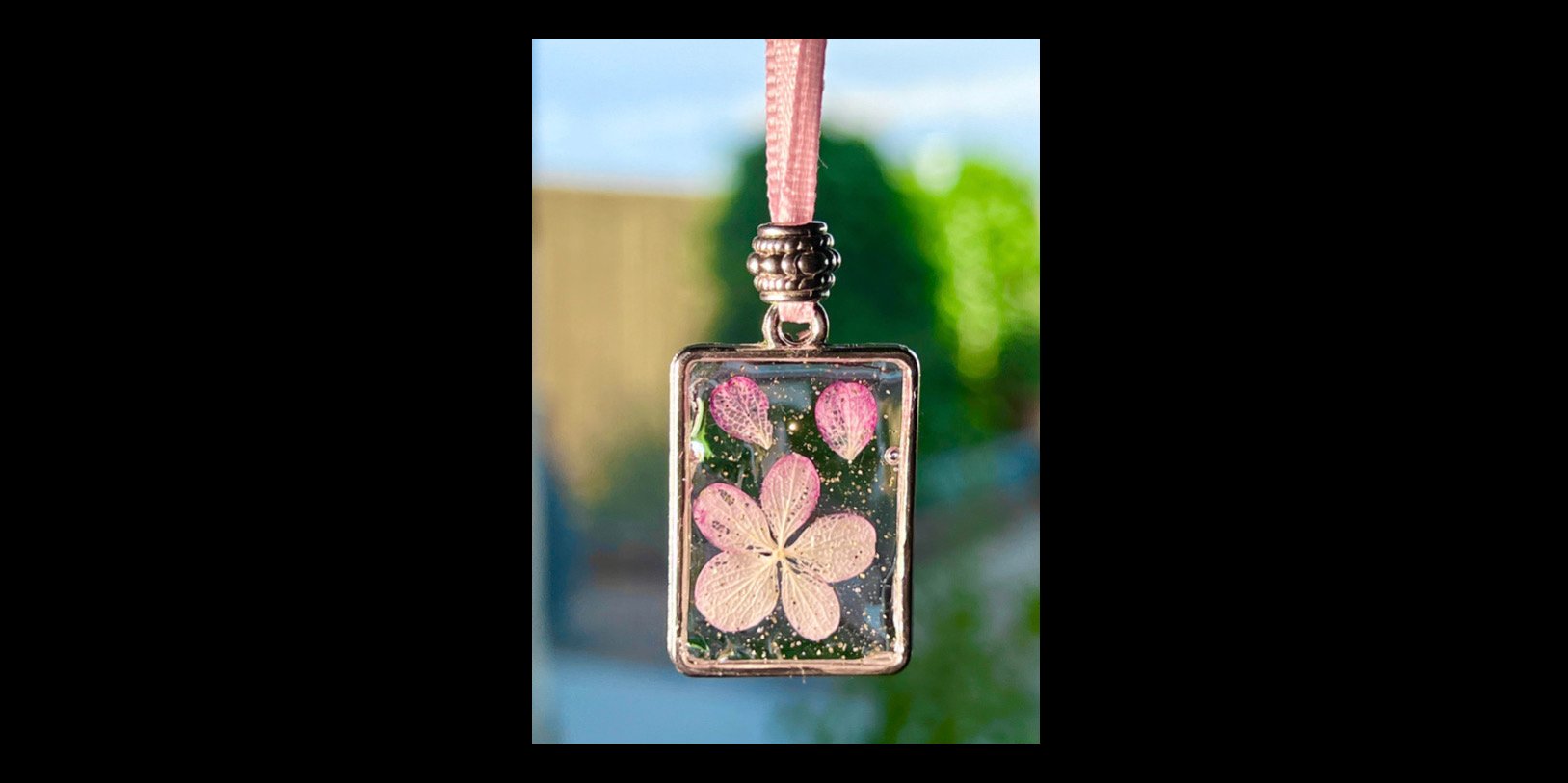 This charming silver-colored square pendant features a Hydrangea bloom and petals. This beautiful flower was grown, dried, carefully hand-pressed, and immortalized in crystal clear resin with a little bit of sparkle, forever capturing its beauty.