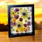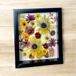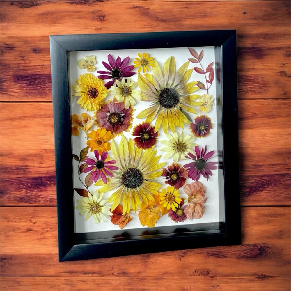 These beautiful Indian Blanket, Nasturtium, Sunflower and Red Cone wildflowers were personally grown and harvested from my garden. They have been carefully hand-pressed, dried and framed in a 8” X 10” classic black shadow box frame with glass. This unique piece of artwork forever captures the beauty of these wildflowers and will provide a gorgeous display for that perfect spot on a wall or desk within your home or office.