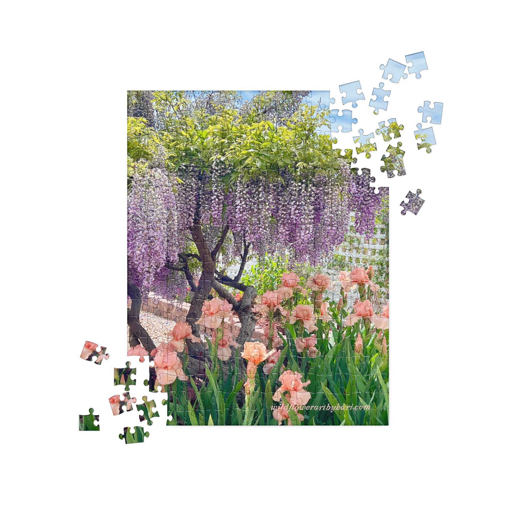 Get lost in creativity, joy, and contentment, alone or with others, while assembling this alluring jigsaw puzzle, which features my blooming Chinese Wisteria and peach Irises. This picture was taken in the spring of 2024.