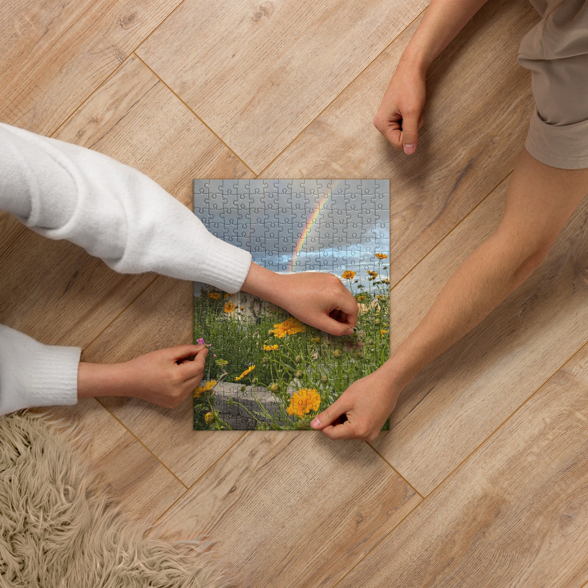 Get lost in creativity, joy, and contentment, alone or with others, while assembling this alluring jigsaw puzzle, which features a beautiful rainbow over my colorful cottage garden with golden Coreopsis. This picture was taken the summer of 2024.