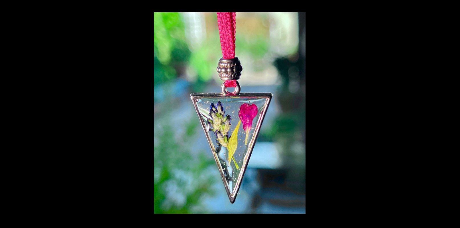This charming silver-colored triangle pendant features blooms of Lavender, Calendula, and pink Stock flower. These beautiful flowers were grown, dried, carefully hand-pressed, and immortalized in crystal clear resin with a little bit of sparkle, forever capturing their beauty.