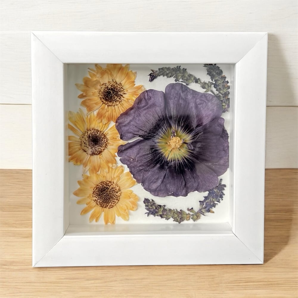 These beautiful Hollyhock, Veronica and Daisy wildflowers were personally grown and harvested from my garden. They have been carefully hand-pressed, dried, and framed in a 6” X 6” vibrant white shadow box frame with glass. This unique piece of artwork forever captures the beauty of these wildflowers and will provide a gorgeous display for that perfect spot on a wall or desk within your home or office.