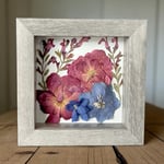 These beautiful Roses, Delphiniums, and Texas Salvia wildflowers were personally grown and harvested from my garden. They have been carefully hand-pressed, dried and framed in a 6” X 6” weathered gray shadow box frame with glass. This unique piece of artwork forever captures the beauty of these wildflowers and will provide a gorgeous display for that perfect spot on a wall or desk within your home or office.