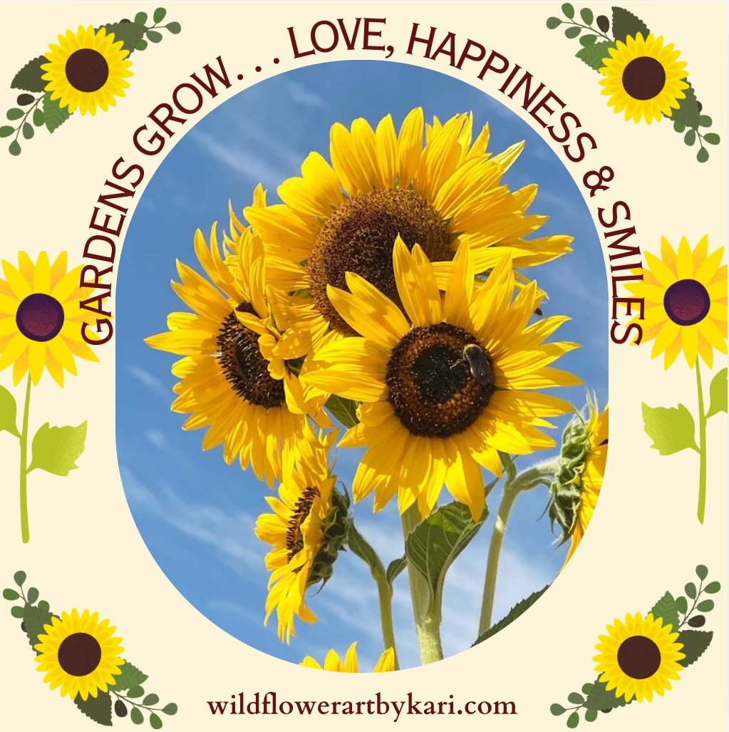 Enjoy wearing this casual, comfy, and cheerful Sunflowers and Bumblebee long sleeved t-shirt during the cooler months of fall and winter. This joyful picture was taken the summer of 2024 in my garden and is encircled by a pleasant and uplifting garden statement.