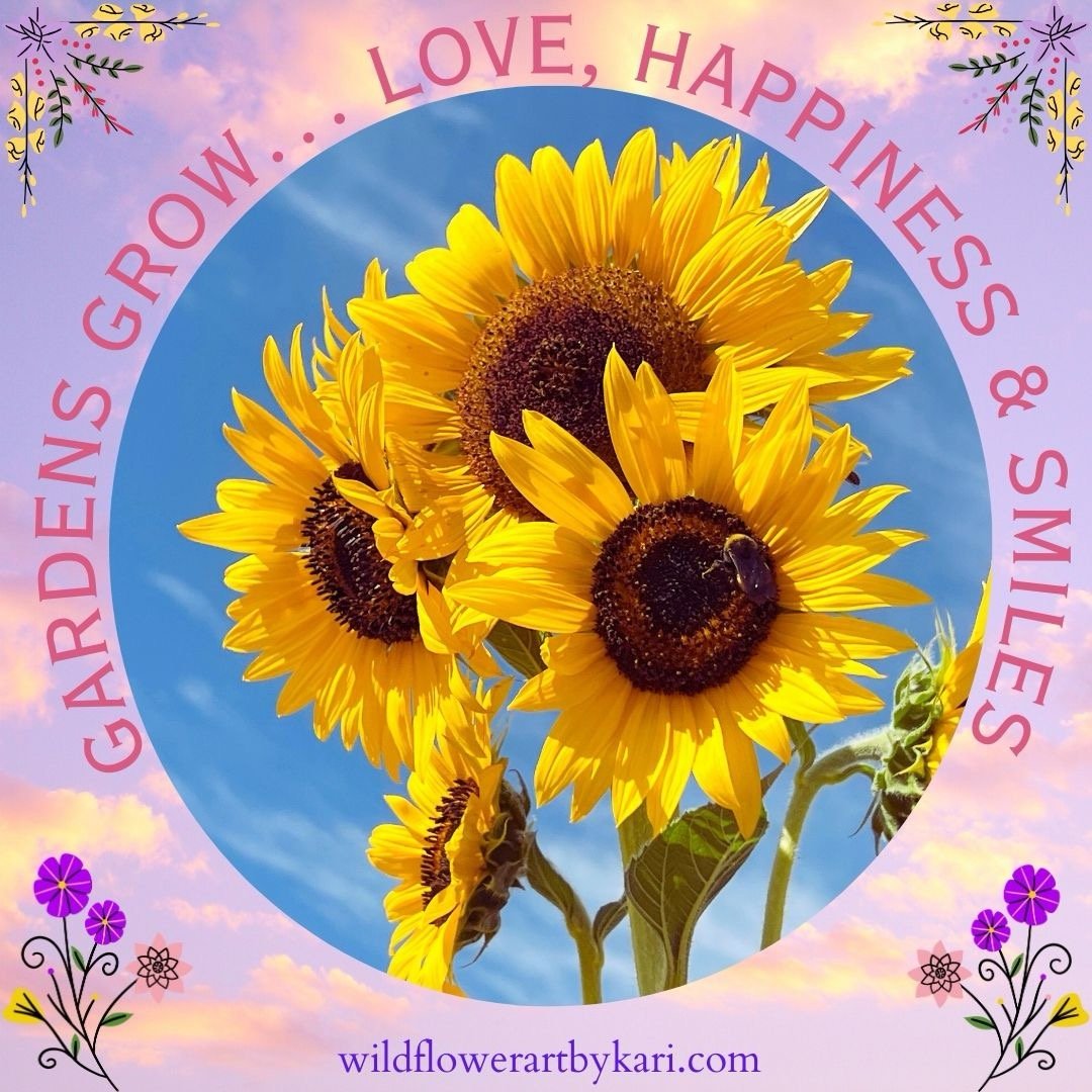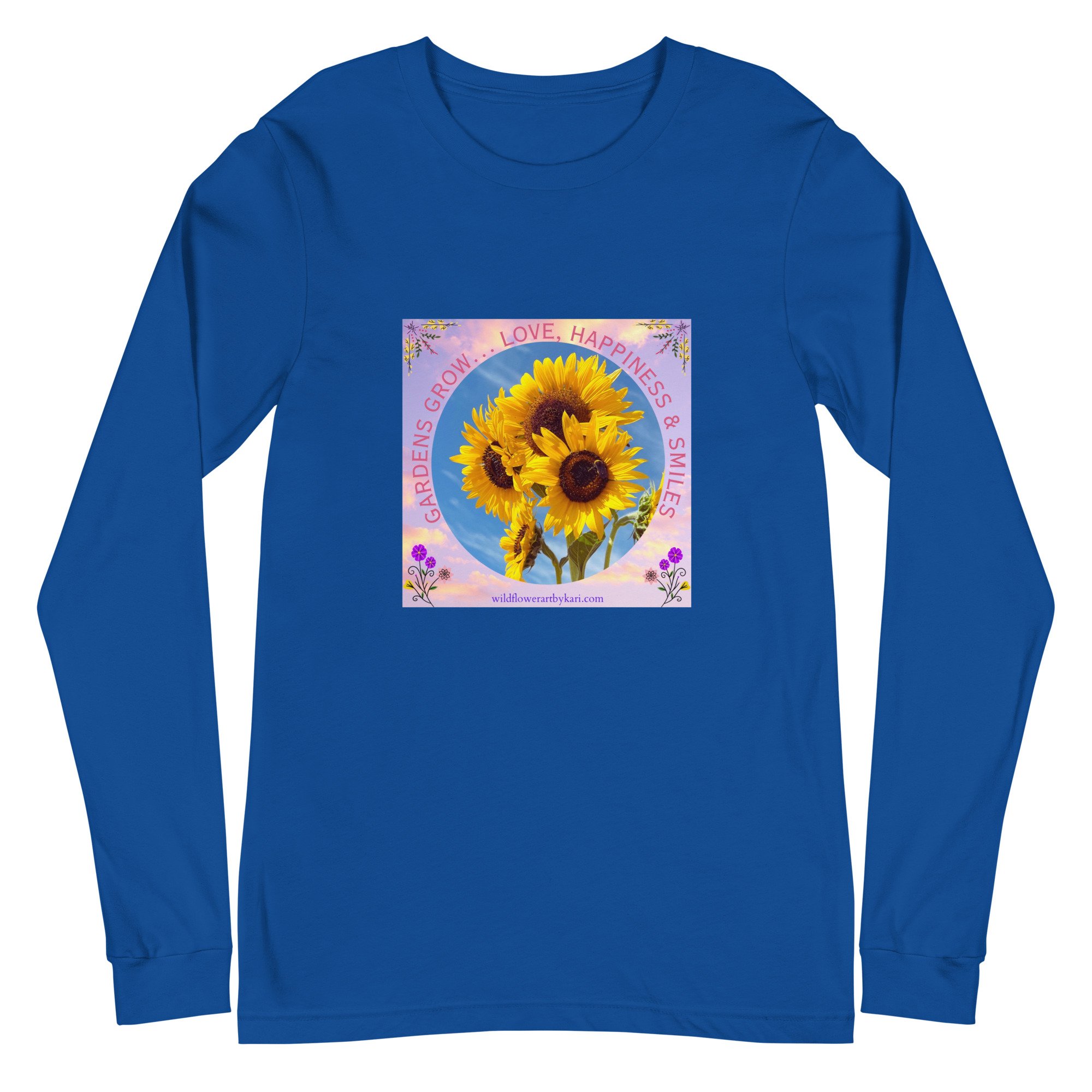 Enjoy wearing this casual, comfy, and cheerful Sunflowers and Bumblebee long sleeved t-shirt during the cooler months of fall and winter. This joyful picture was taken the summer of 2024 in my garden and is encircled by a pleasant and uplifting garden statement.