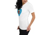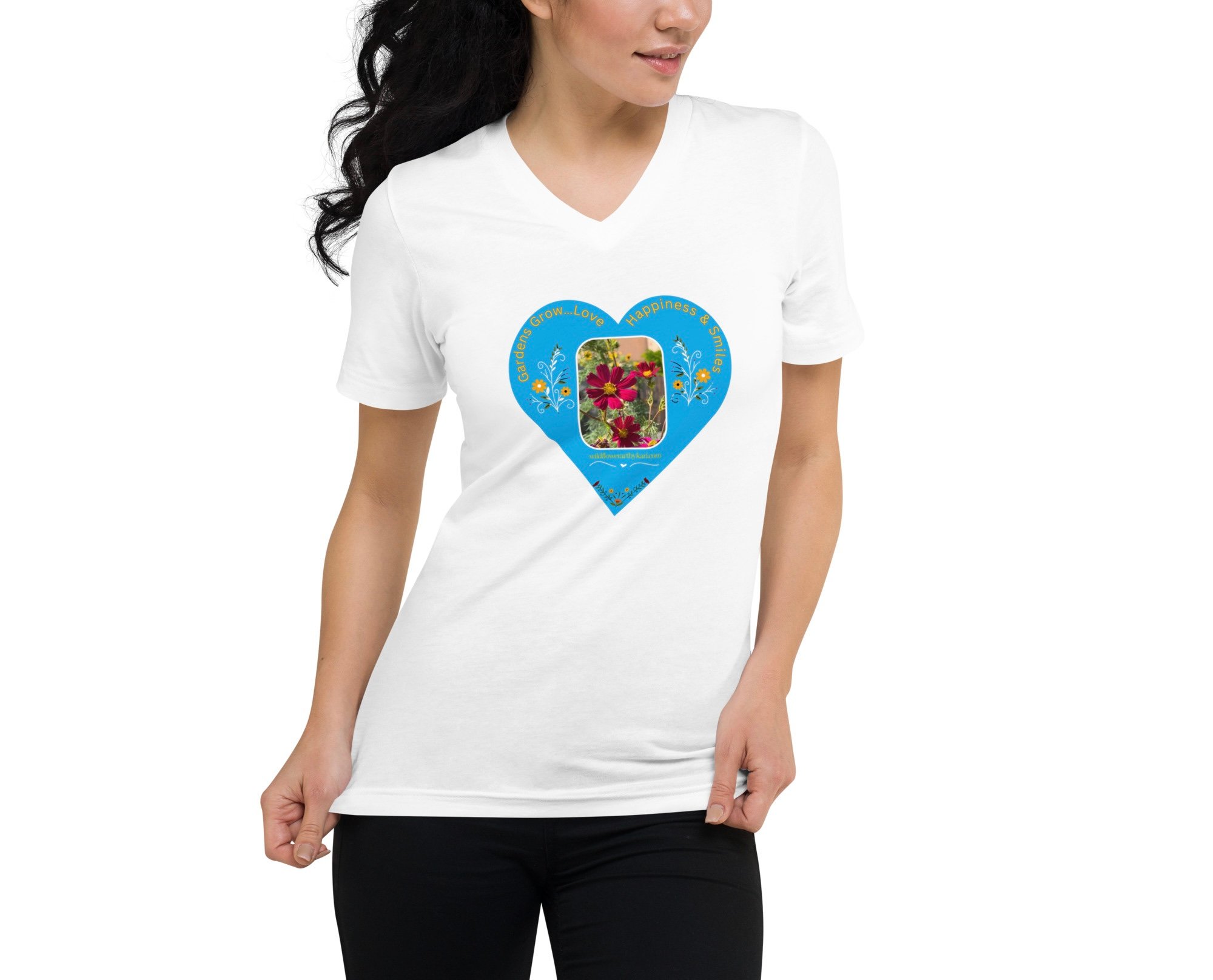 Enjoy wearing this casual, comfy, and cute Cosmo Heart short sleeved, V-neck, t-shirt during the warmer months of spring and summer. This charming picture was taken the summer of 2024 in my garden and is embraced by a pleasant and uplifting garden statement.