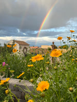 Enjoy wearing this casual, comfy, and cute Rainbow Cottage Garden short sleeved, V-neck, t-shirt during the warmer months of spring and summer. This charming picture was taken the summer of 2024 in my garden and is embraced by a pleasant and uplifting garden statement.