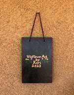 It is approximately 8"x12" in width and length, and is hung by a 6" black rawhide cord that can be shortened by adjusting the knots. This slate piece is painted with acrylic paints and varnished for indoor or outdoor use and is perfect for a porch or patio entry way.