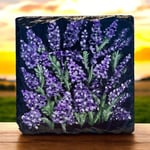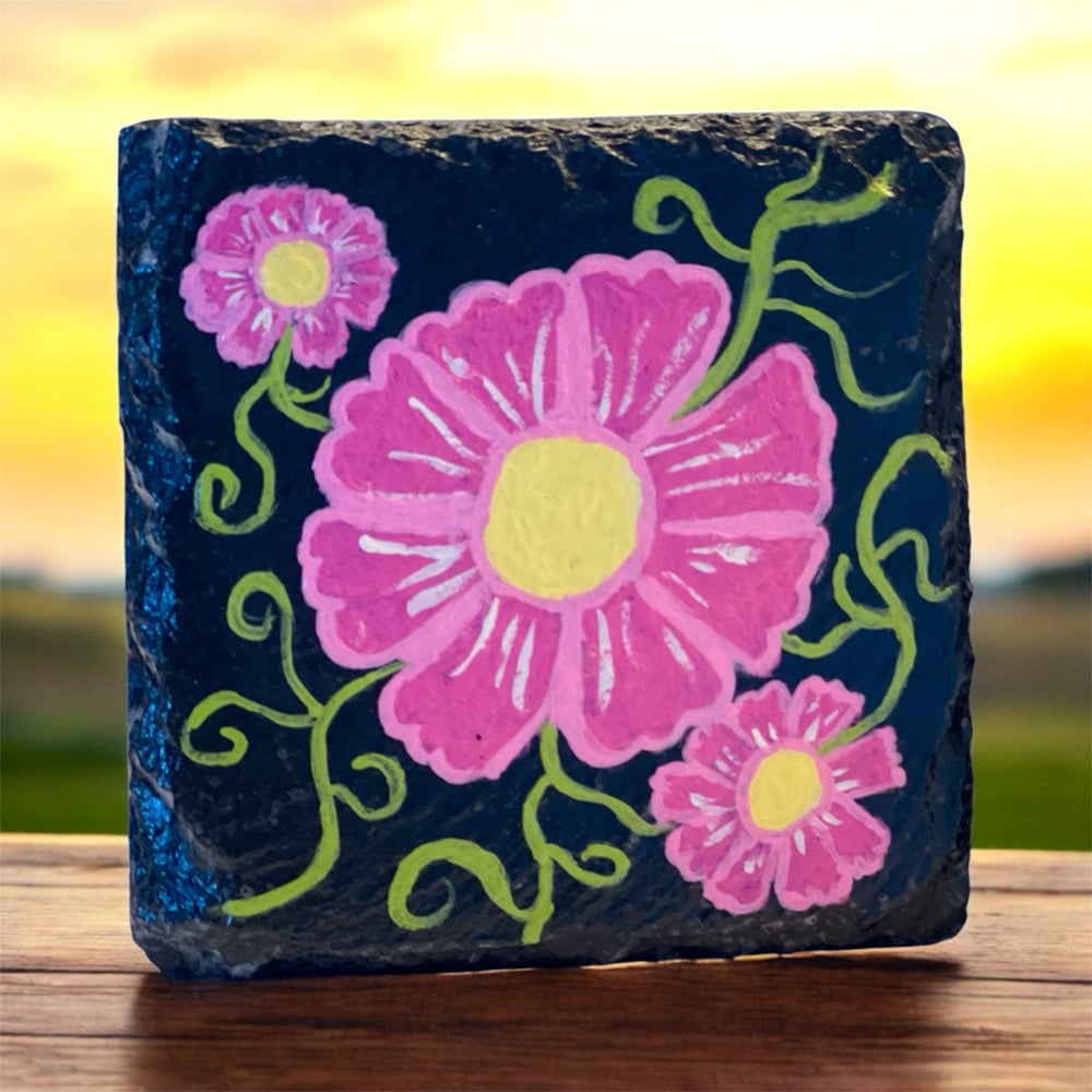 Inspired by my beautiful gardens, this four (4) piece wildflower painted slate coaster set features Cosmos, Hollyhocks, Lavender, and Sunflowers. These coasters are hand painted and shellacked to protect the hand painted surface from scratches and moisture. They can be used indoors and/or outdoors and each coaster measures 3.75” x 3.75” in diameter and are 1/8” thick. The back side of each coaster has four (4) pads to prevent surface scratching. *Coffee mug not included*