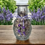 A charming glass urn filled with dried Wisteria blooms from my beautiful Chinese Wisteria bonsai. Wrapped in a soft lavender satin ribbon with delicate beads, these delicate blossoms are gently infused with the sweet, uplifting scent of Jasmine essential oil to brighten and bring a sense of joy to any space.