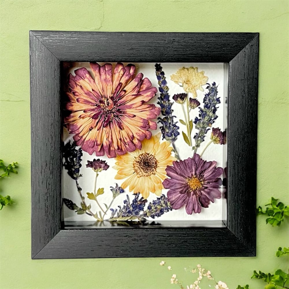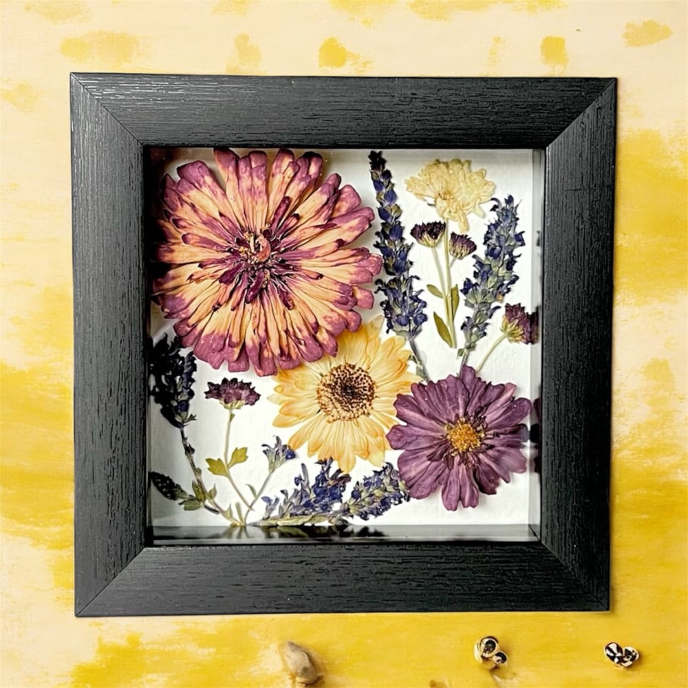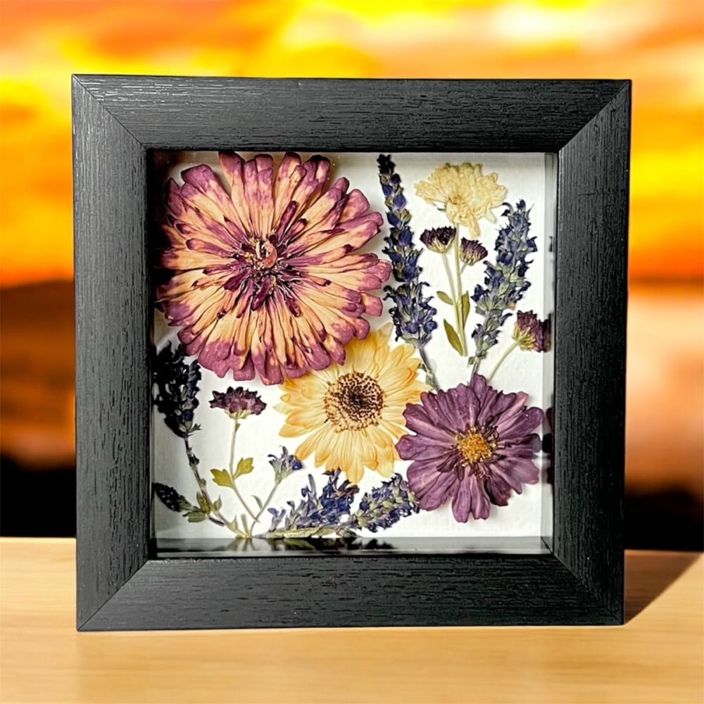These beautiful Zinnia, Chrysanthemums, Cosmo, and Lavender wildflowers were personally grown and harvested from my garden. They have been carefully hand-pressed, dried, and framed in a 6” X 6” classic black shadow box frame with glass. This unique piece of artwork forever captures the beauty of these wildflowers and will provide a gorgeous display for that perfect spot on a wall or desk within your home or office.