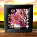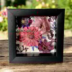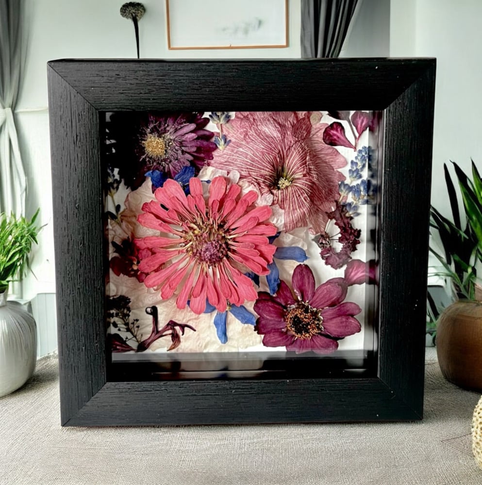 These beautiful Zinnias, Hollyhock, Cosmo, Delphiniums, Hyacinths, and Lavender wildflowers were personally grown and harvested from my garden. They have been carefully hand-pressed, dried, and framed in a 6” X 6” classic black shadow box frame with glass. This unique piece of artwork forever captures the beauty of these wildflowers and will provide a gorgeous display for that perfect spot on a wall or desk within your home or office.